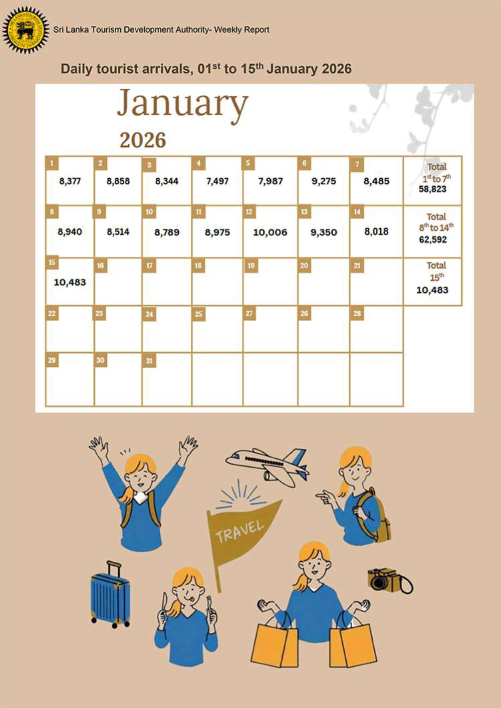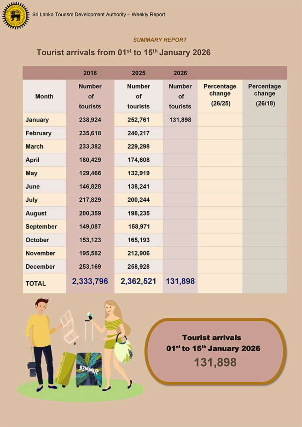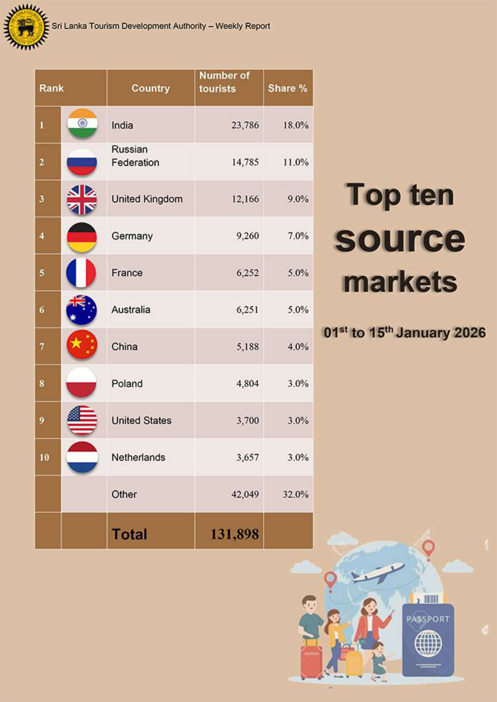 2026 වසරේ ගත වූ පළමු දින 15 තුළ 131,898 ක සංචාරකයින් පිරිසක් මෙරටට පැමිණ ඇති බව ශ්රී ලංකා සංචාරක සංවර්ධන අධිකාරිය සඳහන් කරනවා.