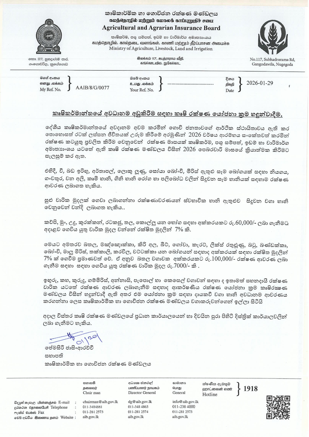 January 29 (Citizen.lk News) - 2026 පෙබරවාරි මාසයේ සිට ක්රියාත්මක වන පරිදි කෘෂිකර්ම, පශු සම්පත්, ඉඩම් හා වාරිමාර්ග අමාත්යාංශය යටතේ ඇති කෘෂිකාර්මික හා ගොවිජන රක්ෂණ මණ්ඩලය විසින් ගොවි ජනතාව වෙනුවෙන් රක්ෂණ මාසයක් ප්රකාශයට පත් කර තිබෙනවා.