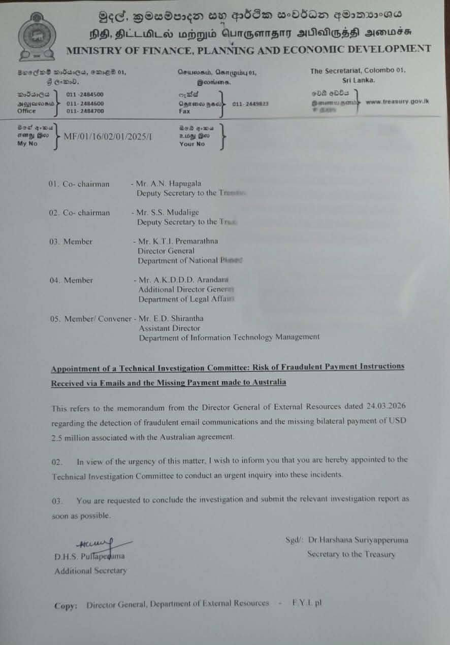 මෙවැනි විශාල මුදල් ගෙවීම් අනුමත කිරීම හා නිර්දේශ කිරීමට රාජ්ය ණය කළමනාකරණ කාර්යාලයේ කණිෂ්ඨ නිලධාරීන්ට හැකියාවක් නැත. මුදල් අමාත්යාංශයේ ලේකම්, නියෝජ්ය භාණ්ඩාගාර අධ්යක්ෂ ජනරාල්වරුන් එයට සෘජුව හා වගකීම් සහිතව දායක වේ. නමුත් 2026 මාර්තු 24 දින පත් කර ඇති Technical Investigation Committee සඳහා පත්කර ඇති සම - සභාපතිවරුන් වන ඒ.එන්. හපුගල සහ එස්.එස්.මුදලිගේ මෙම ක්රියාවලියට සෘජුව සම්බන්ධ හා අධීකෂණය හා මෙහෙයවීම සිදු කළ නිලධාරීන් වෙති.